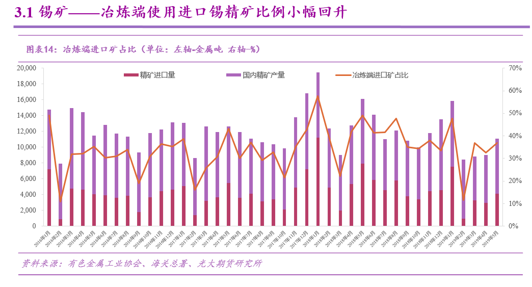 6月,国内进口锡精矿1.24万吨,同比下滑47%。其中从缅甸进口1.14万吨,同比下滑51%。