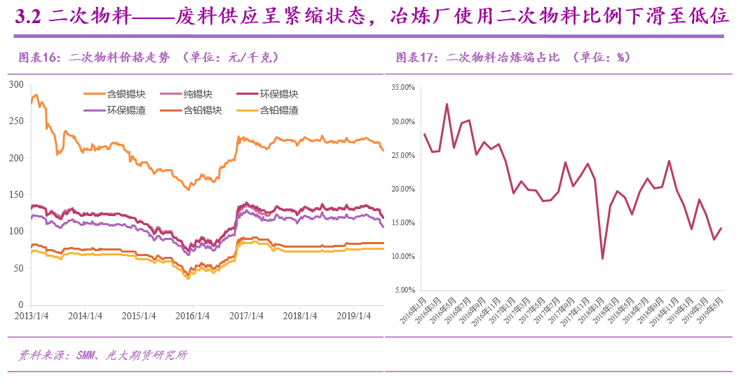 由于今年年初以来环保、固废进口等政策趋严,处理成本抬升使废料供给量减少,导致冶炼厂使用废料占比降低。据ITA预测,目前废料加工费从2500元/吨降至1500元/吨,已到部分厂家的成本线下。