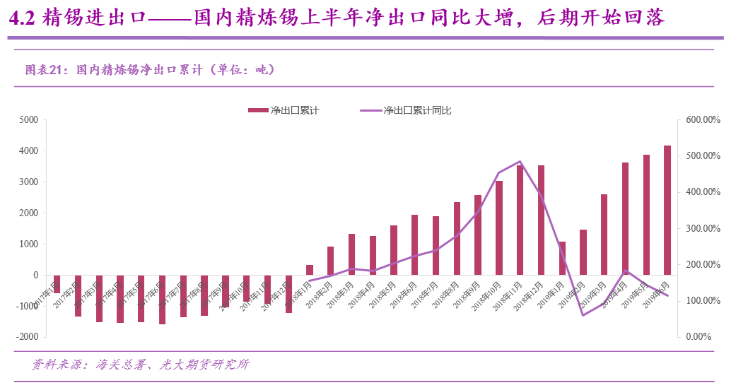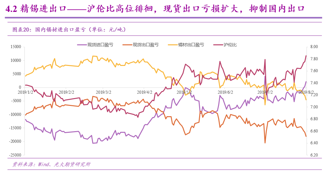 6月,国内进口精炼锡547吨,出口833吨,净出口286吨,累计净出口同比增长114%。国内净出口量有所回落,主要因为最近一段时间沪伦比高位运行并且伦锡库存较高,出口已无太多利润导致。