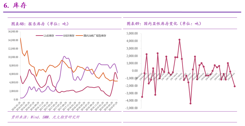 由于6月份国内产量高企和显性库存的减少,导致6月国内表观消费量大幅增加。但是根据我司调研,国内上半年的需求持续下滑并未有转好的状态,所以估计此次表观消费量的高企是由于大量隐性库存存在的原因,尤其是冶炼厂和贸易商库存的不透明影响了此次表观消费量的计算。