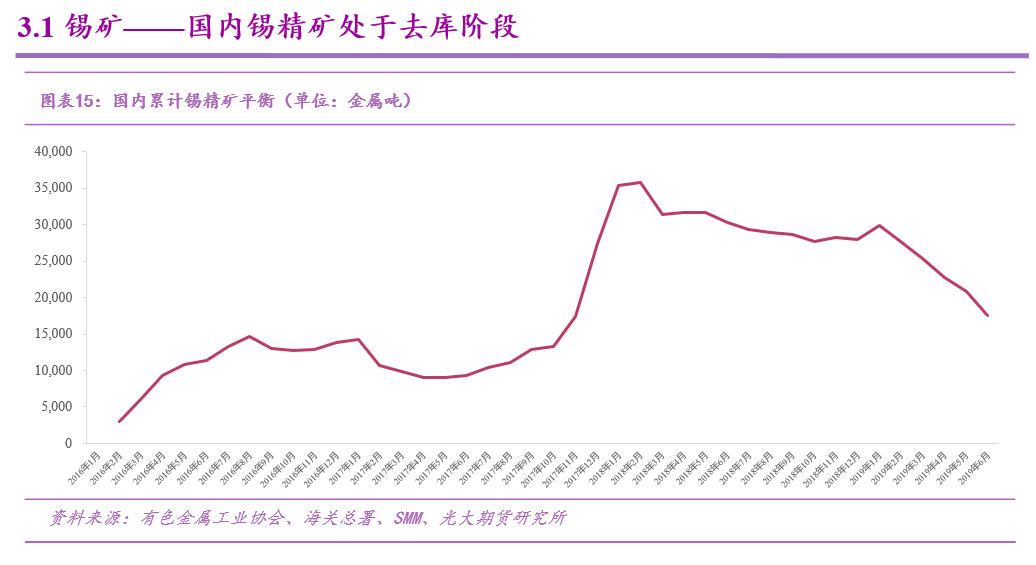 6月,国内矿山自产锡精矿8050金吨,环比增15%,同比减少3%。上半年累计产锡精矿4.2万金吨,同比减少9%。