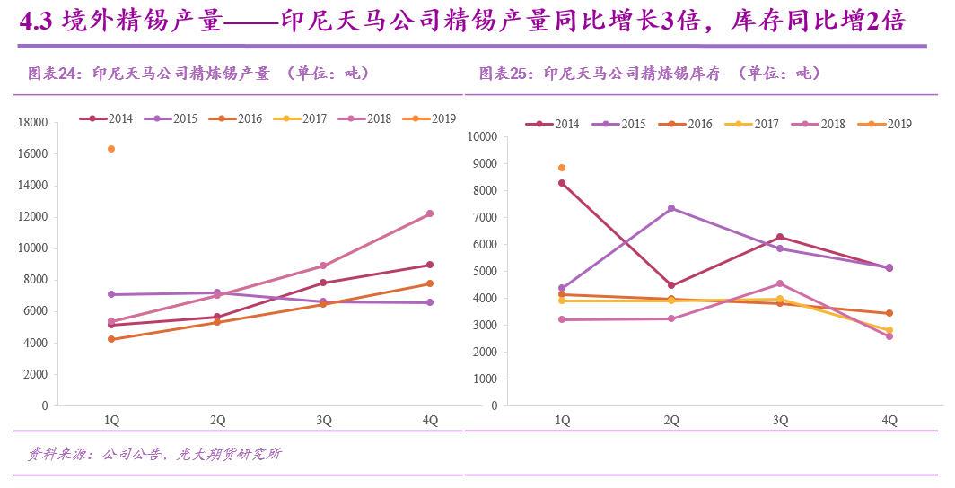 受益于去年下半年印尼政府强硬政策挤出了大部分私人冶炼厂,天马公司今年一季度精矿和精炼锡产量同比均增加3倍以上。其运营总监称,公司今年预计将生产70000吨精炼锡,为去年的2倍左右。但是公司公告显示一季度公司精炼锡现金成本为18776US$/t,近段时间伦锡价格运行区间均低于此价格,这或将打击天马公司出口热情。