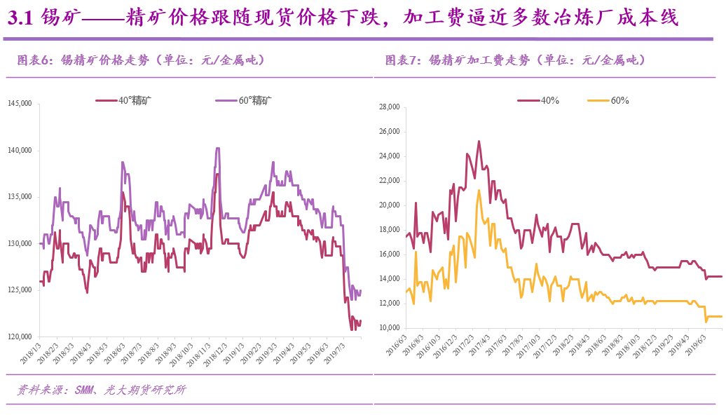 锡精矿和二次物料加工费已处于历史较低水平,触及部分冶炼厂成本线。 •精矿和废料供给紧张且加工费低迷将有效倒逼部分冶炼厂减产或停产,减少精炼锡供给。