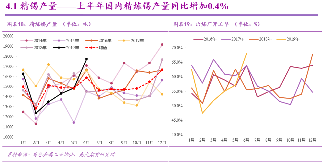 6月国内精炼锡生产17718吨,环比增加20%,同比增加23%,累计同比增加0.4%。冶炼厂开工率大幅提升,为近4年来的历史高位。此次有色协会6月份产量数据与其他咨询机构调研数据走差近5000吨/月,据了解偏差较大的地区为云南,猜测可能是由于7月初的大跌影响了部分调研厂家数据的真实性造成的。下半年预计由于精矿和废料同时减少,冶炼厂或将有效减产。