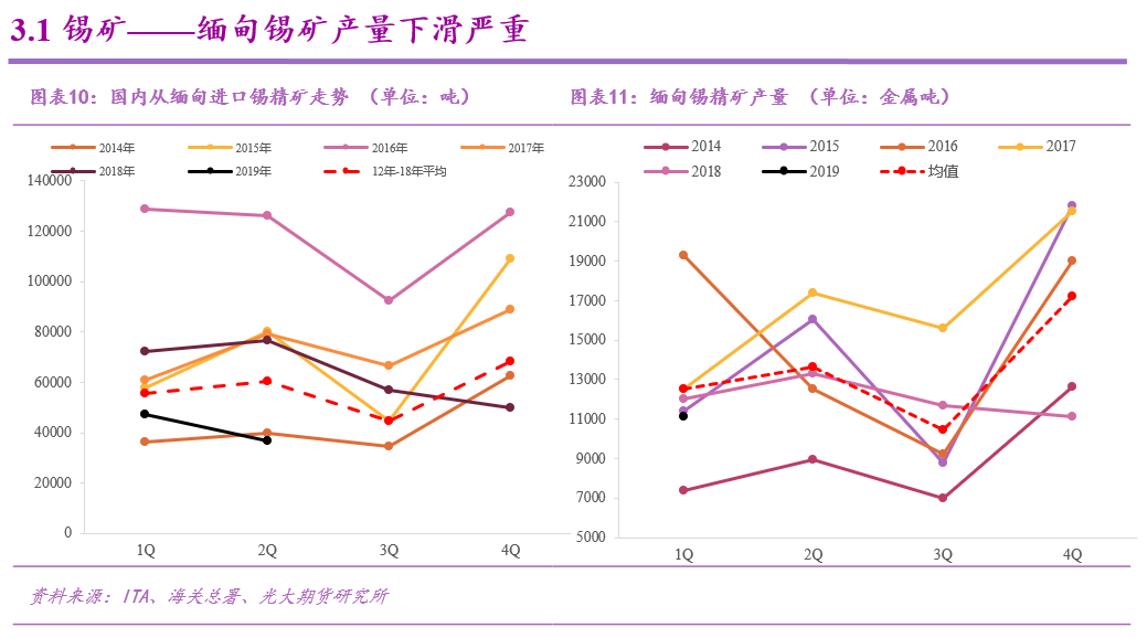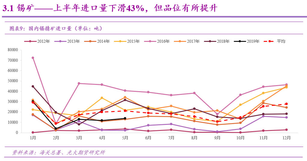 上半年,国内共进口锡精矿8.6万吨,同比下滑43%,从缅甸进口8.4万吨,同比下滑44%。但受益于缅甸当地选厂技术的提高,进口锡矿品位较去年提升。预估上半年从缅甸进口的锡精矿金属量为2.2万吨,较去年同期减少了25%以上。