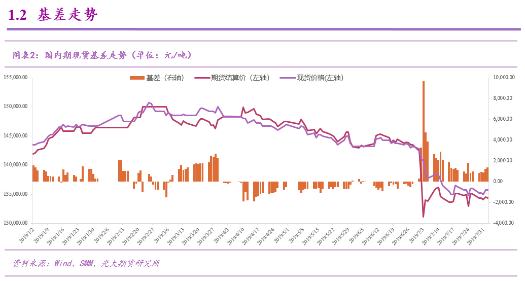 7月自暴跌后,现货市场转为升水格局。暴跌首个礼拜部分现货商和冶炼厂联合挺价,现货升水颇高,下游趁低价补货积极。随后因价格未如逾期重回横盘区间,现货升水回落,而之前下游透支未来需求补货造成现货市场成交氛围低迷,尚不如暴跌前成交活跃。但即使下游接货意愿不高,但升水格局却一直未有转向,表明市场目前现货供应有所紧张。