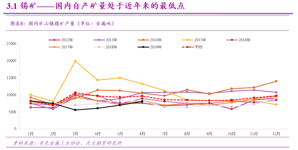 年初因银漫矿业发生事故导致内蒙矿山基本停止作业,其他矿山因环保政策、产出精矿品味持续下滑等原因产出也有所减少,叠加下导致了今年上半年锡矿产量数据为2012年以来的最低水平。预计未来若锡价持续弱势状态,国内锡精矿的产量将继续下滑。